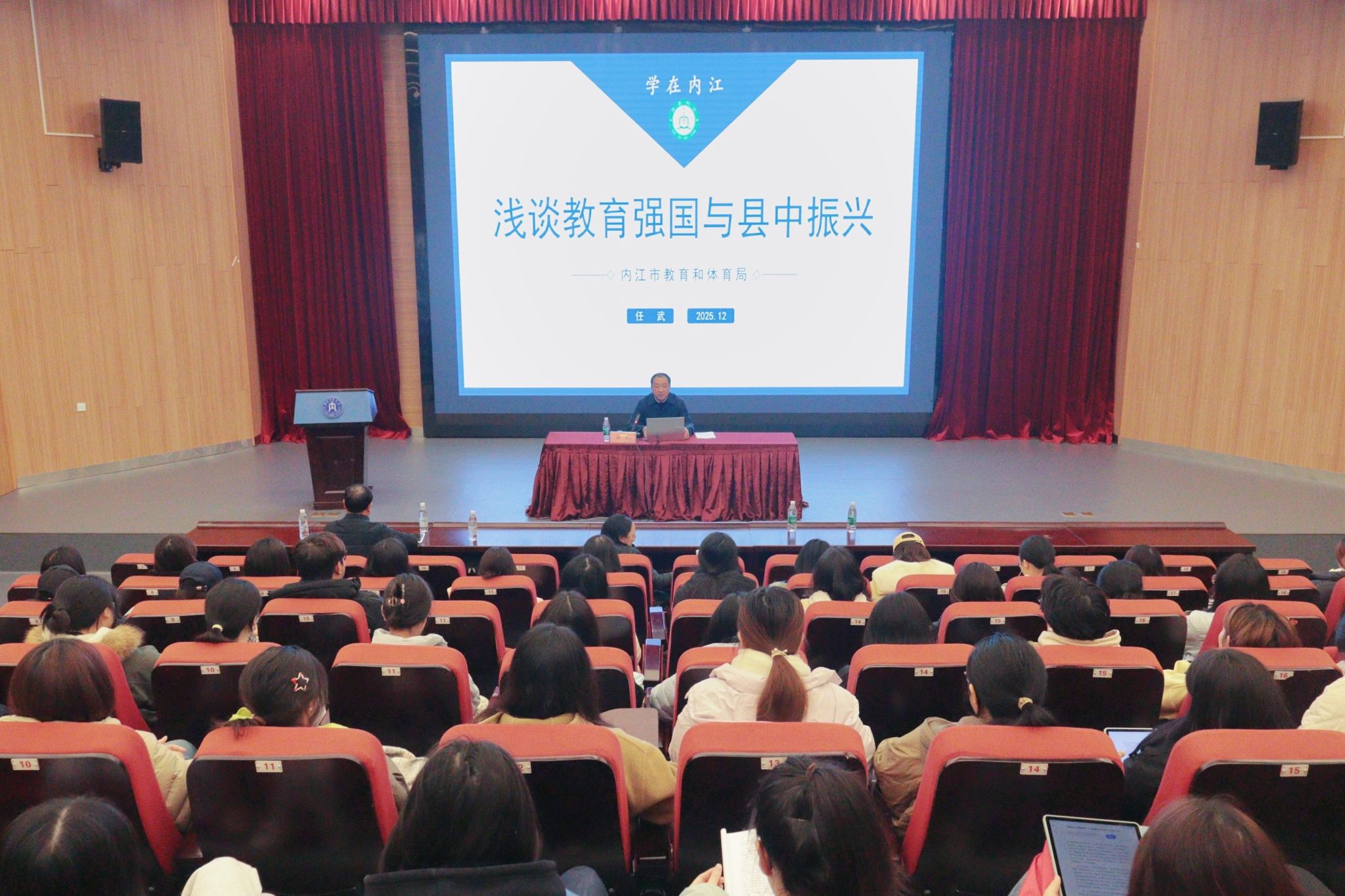 为深入学习贯彻习近平总书记关于教育的重要论述,引导文学院学子深刻领悟县域教育发展所蕴含的时代机遇,明确个人成长路径,强化责任担当意识, 2025年12月12日下午,文学院于大千楼A102教室举办“县域高中振兴:教育强国与县中振兴”专题讲座。讲座特邀内江市委教育工委委员、市教育体育局党组成员、副局长任武同志担任主讲嘉宾。文学院领导与教师、学生代表到场聆听讲座。
