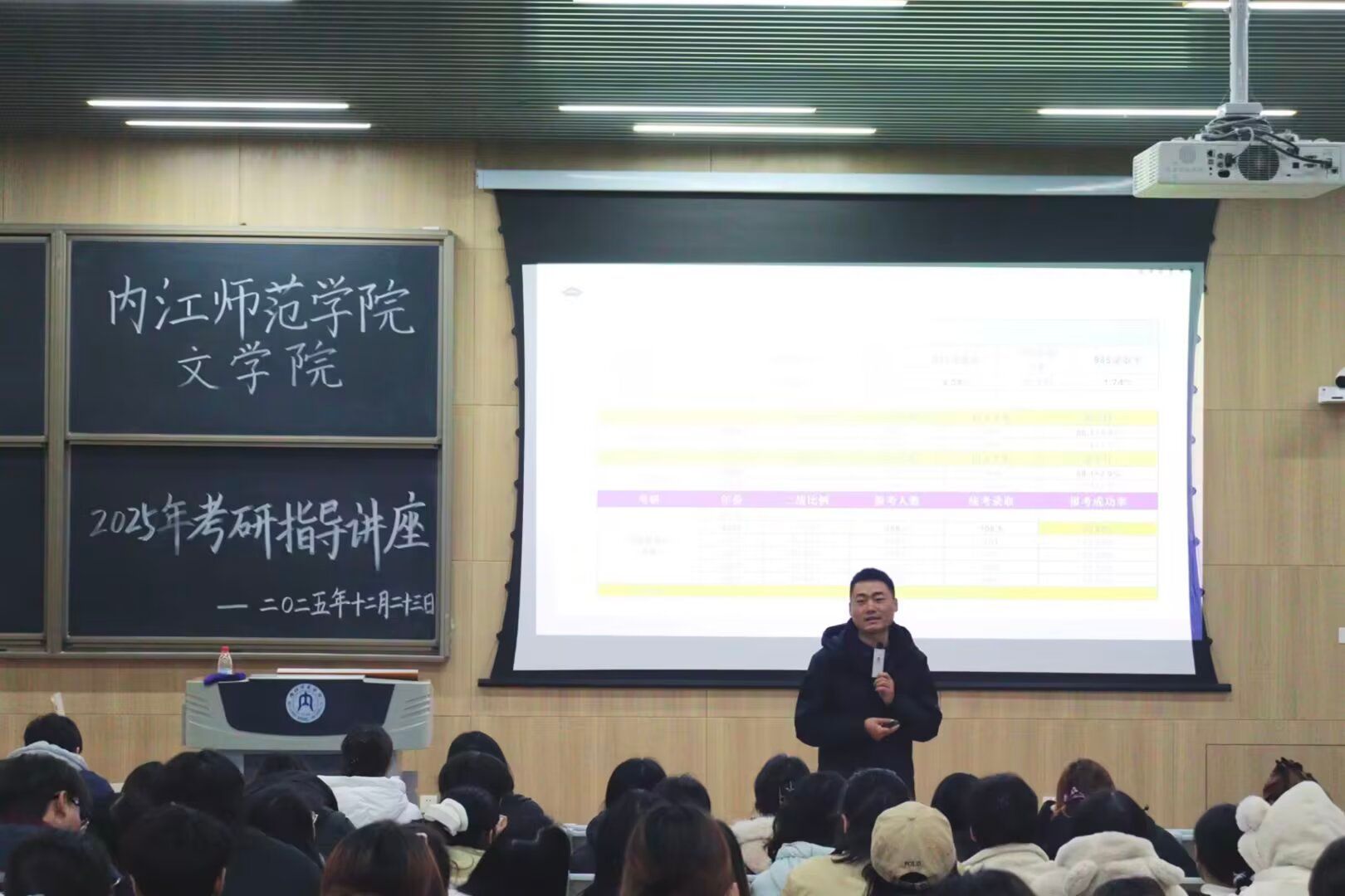 讲座现场,主讲人陶晓峰老师以就业与考研的双向选择为切入点,结合当下就业市场的岗位需求与考研竞争态势,细致分析两者的发展路径与适配方向,引导学生结合自身专业基础、兴趣志向做出理性规划。随后,陶老师通过投影展示二战比例、报考人数、统考录取数及报考成功率等考研核心数据,清晰勾勒出2021至2025年考研的整体趋势。其中2025年20.62%的报考成功率,让同学们直观感受到考研的竞争强度,也深刻意识到科学备考的重要性。