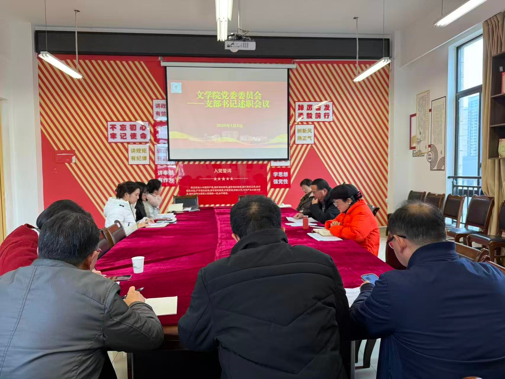 2026年1月5日下午,内江师范学院文学院党委在弘文楼506会议室召开党委委员会(扩大)会议,专题学习中共中央政治局民主生活会精神,并集中听取所属5位教工、学生党支部书记2025年度抓党建工作述职。学院党委委员、各支部书记参会,会议由党委书记周艺主持。