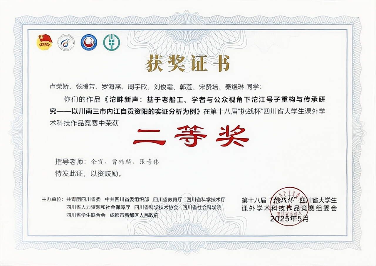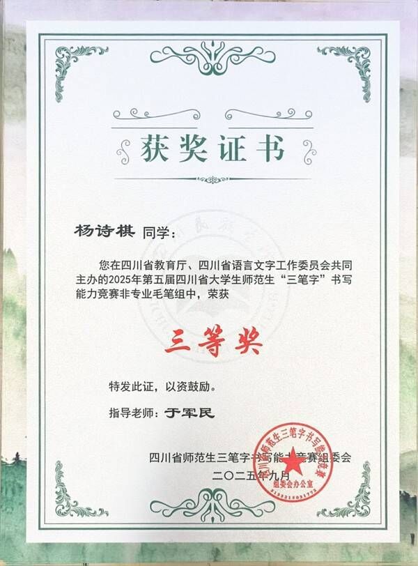 师范素养培育成果丰硕。学生在第十一届“田家炳杯”全国师范院校师范生教学技能竞赛、川渝第四届师范生教学能力大赛、 “诗教中国” 诗词讲解大赛、师范生 “三笔字” 大赛等赛事中斩获多项省级荣誉,尽显专业积淀;志愿服务领域亮点突出,学生深度参与川渝地区相关赛事及 “两弹一星” 精神全国志愿宣讲,获国家、省级双重表彰。学术科研与创新创业领域实现质的飞跃,中国国际大学生创新大赛获省级铜奖,多个大创项目获批省级立项,学生参与“挑战杯”赛事,先后获省级、国家级荣誉。